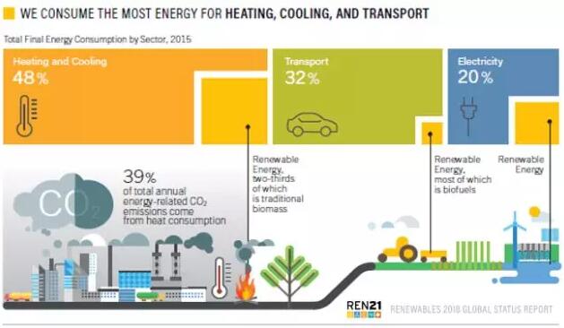 能源需求和能源相關(guān)的二氧化碳排放量四年來(lái)首次大幅增加。 由于新興經(jīng)濟(jì)體的經(jīng)濟(jì)增長(zhǎng)和人口增長(zhǎng),全球能源需求在2017年增長(zhǎng)了2.1%,能源相關(guān)的二氧化碳排放量增加了1.4%。可再生能源增長(zhǎng)實(shí)現(xiàn)的二氧化碳減排,無(wú)法抵消不斷增長(zhǎng)的能源需求以及對(duì)化石和核能持續(xù)投資所造成的排放增量。電力行業(yè)面向可再生能源的轉(zhuǎn)型正在進(jìn)行中,但轉(zhuǎn)型的速度比原本可能的或理想的要慢得多。2015年巴黎氣候協(xié)定做出的將全球氣溫上升限制在“遠(yuǎn)低于”工業(yè)化前水平2攝氏度的承諾,使得這一挑戰(zhàn)更加突出。如果世界要實(shí)現(xiàn)巴黎協(xié)定中設(shè)定的目標(biāo),那么供熱、制冷和交通領(lǐng)域必須依照電力行業(yè)轉(zhuǎn)型的模式并以更快的速度進(jìn)行能源轉(zhuǎn)型。當(dāng)前這些領(lǐng)域: