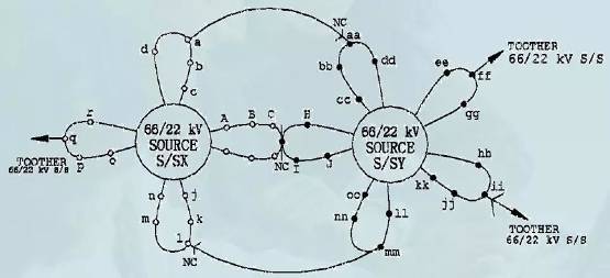 新加坡整個(gè)電網(wǎng)分為400、230、66千伏輸電網(wǎng)絡(luò)和22、6.6千伏及400/230伏配電網(wǎng)絡(luò)。22千伏配網(wǎng)接線方式考慮N-1原則,采用以變電站為中心的花瓣形接線,即同一個(gè)雙電源變壓器并聯(lián)運(yùn)行的變電站(66/22千伏)的每?jī)苫仞伨€構(gòu)成環(huán)網(wǎng),閉環(huán)運(yùn)行,不同電源變電站的花瓣間設(shè)置聯(lián)絡(luò)開關(guān),處于常開狀態(tài)。22千伏配電線路均裝設(shè)縱差保護(hù),至客戶或變壓器的支路采用過(guò)流和接地保護(hù)。環(huán)網(wǎng)最大負(fù)荷電流不超過(guò)400安培,環(huán)網(wǎng)的設(shè)計(jì)容量為15兆伏安,饋線按照50%負(fù)荷設(shè)計(jì),且全部實(shí)現(xiàn)電纜化、全戶內(nèi)配電裝置。花瓣式接線如圖1所示。