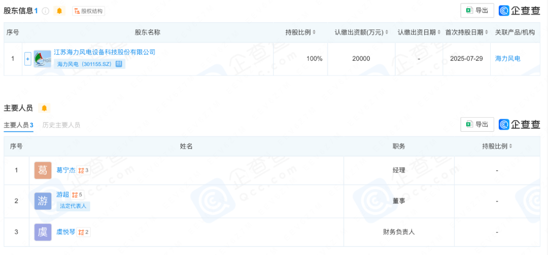 近日,海力海上風(fēng)電裝備(溫州)有限公司成立,法定代表人為游超,注冊(cè)資本為20000萬(wàn)元。新公司經(jīng)營(yíng)范圍包含:新能源原動(dòng)設(shè)備制造;海上風(fēng)電相關(guān)裝備銷售;海洋工程裝備制造;海洋工程裝備銷售;海洋工程平臺(tái)裝備制造;海洋能系統(tǒng)與設(shè)備銷售;海洋能系統(tǒng)與設(shè)備制造;海洋工程關(guān)鍵配套系統(tǒng)開發(fā);海上風(fēng)電相關(guān)系統(tǒng)研發(fā);風(fēng)電場(chǎng)相關(guān)系統(tǒng)研發(fā);風(fēng)電場(chǎng)相關(guān)裝備銷售等。企查查股權(quán)穿透顯示,該公司由江蘇海力風(fēng)電設(shè)備科技股份有限公司100%持股。