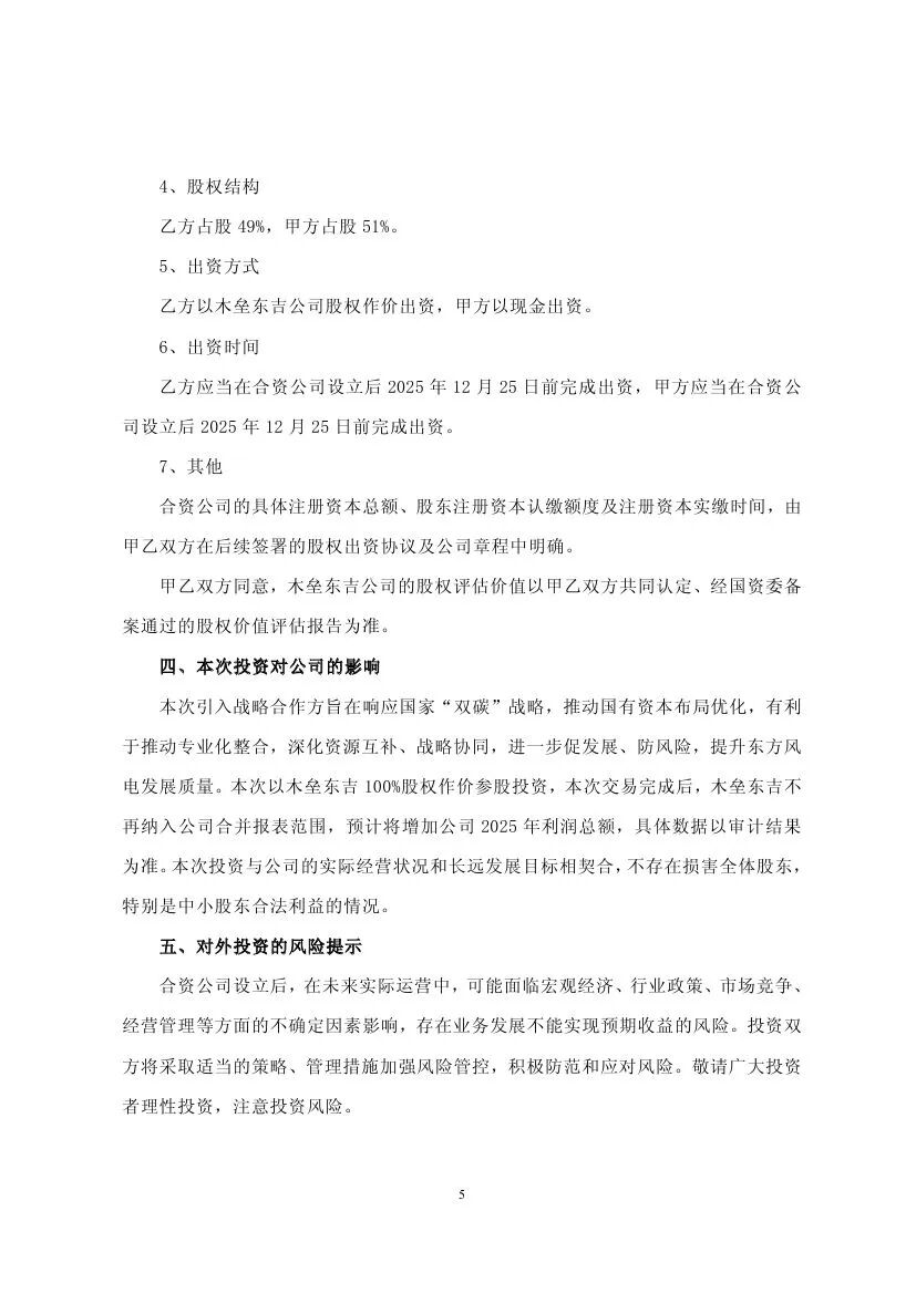 東方電氣控股子公司與皖能能源共同成立合資公司,東方風(fēng)電持股49%,皖能能源持股51%。合資公司注冊資本為:185,683.0205萬元,東方風(fēng)電以木壘東吉新能源有限公司100%股權(quán)作價出資,根據(jù)北京天健興業(yè)資產(chǎn)評估有限公司出具的資產(chǎn)評估報告,基于評估基準(zhǔn)日2025年6月30日,木壘東吉新能源有限公司評估后的股東全部權(quán)益價值為90,984.68萬元,皖能能源以94,698.3405 萬元現(xiàn)金出資。