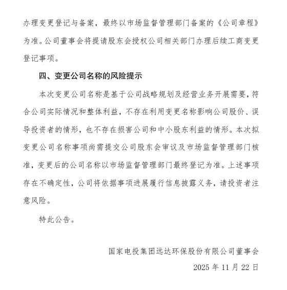 11月22日,遠達環保發布公告稱,公司于11月21日召開第十屆董事會第三十五次(臨時)會議,審議通過了《關于增加注冊資本、變更公司名稱并修訂<公司章程>的議案》。為全面匹配公司重大資產重組后的業務戰略轉型,精準凸顯水電主業核心定位,強化品牌主業辨識度,公司擬變更公司名稱,由“國家電投集團遠達環保股份有限公司”變更為“國家電投集團水電股份有限公司”(暫定名,以工商部門核名為準)。