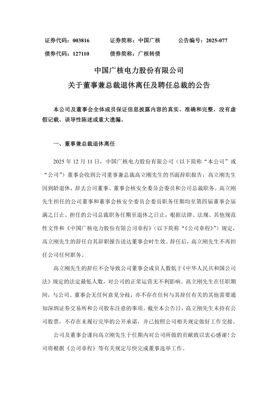 中國廣核電力股份有限公司收到公司董事兼總裁高立剛先生的書面辭職報告,高立剛先生因到齡退休,辭去公司董事、董事會核安全委員會委員和公司總裁職務(wù),辭任自辭職報告送達(dá)董事會時生效,辭任后高立剛先生不再擔(dān)任公司任何職務(wù)。