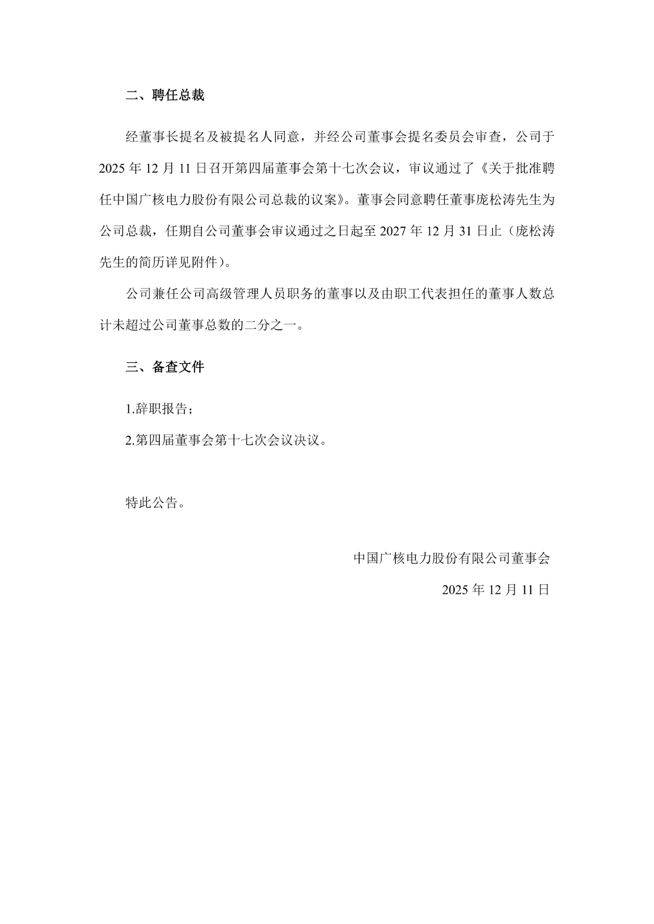12月11日,中國廣核電力股份有限公司(證券簡稱:中國廣核)召開第四屆董事會第十七次會議,審議通過《關(guān)于批準(zhǔn)聘任中國廣核電力股份有限公司總裁的議案》,同意聘任董事龐松濤先生為公司總裁,任期自公司董事會審議通過之日起至2027年12月31日止 。