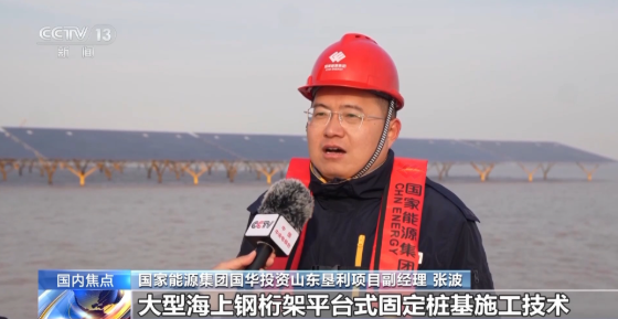 國家能源集團國華投資山東墾利項目副經理 張波:項目在全國創新應用大型海上鋼桁架平臺式固定樁基施工技術,采用“四樁基礎+光伏平臺”優化結構,平臺傾角為精準調校的15度,不僅能抵抗11級強風和冬季冰情,還能節約項目用鋼量超10%,為同類項目開發建設提供經驗借鑒。