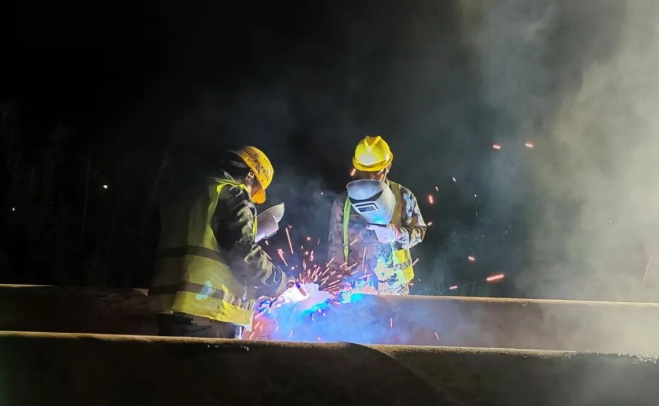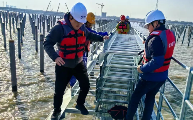 面對潮間帶施工困難的情況,林洋新能源建設團隊將先筑臺、后建站定為首要任務。根據施工規劃,兩座6400平方米的貝雷結構平臺需在1個月內建成,項目組實行設計、施工、監測三班倒機制:技術組白天駐守現場優化鋼管樁打入角度,夜晚核算貝雷架承重數據;施工隊分成打樁、焊接、防腐三個班組交叉作業,在每日兩次潮水退去的間隙搶工。在團隊的齊心協作下,直徑0.63米的鋼管樁群穩穩扎入灘涂,連接平臺與海堤的鋼棧橋同步貫通,為后續近9萬根預制樁、百萬塊組件的運輸安裝奠定基礎。
