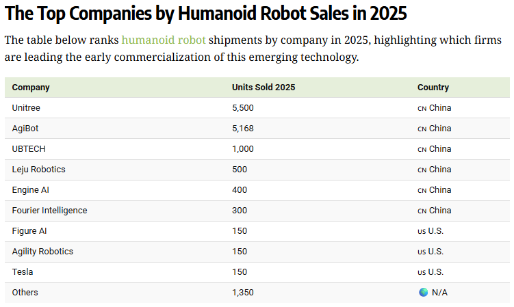 2025年,特斯拉交付了150輛Optimus,預(yù)計將于2027年開始公開銷售。同樣,其他美國領(lǐng)先公司 Figure AI 和 Agility Robotics 的出貨量也大致相同。盡管迄今為止交付量有限,F(xiàn)igure AI 的估值仍飆升至 390 億美元,遠高于 2024 年的 26 億美元。中國憑借完善的供應(yīng)鏈體系、核心技術(shù)自主化突破及多場景落地優(yōu)勢,穩(wěn)居全球人形機器人產(chǎn)業(yè)第一大國。
