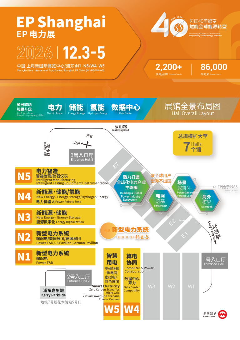 2026年是EP電力展繼往開來的一年。本屆展會首次啟用N1至N5館、W4館及W5館,共計七大展館,展覽總面積預計突破86,000平方米,這不僅標志著展會規模的再一次飛躍,更彰顯了電力行業蓬勃的發展活力與市場信心。