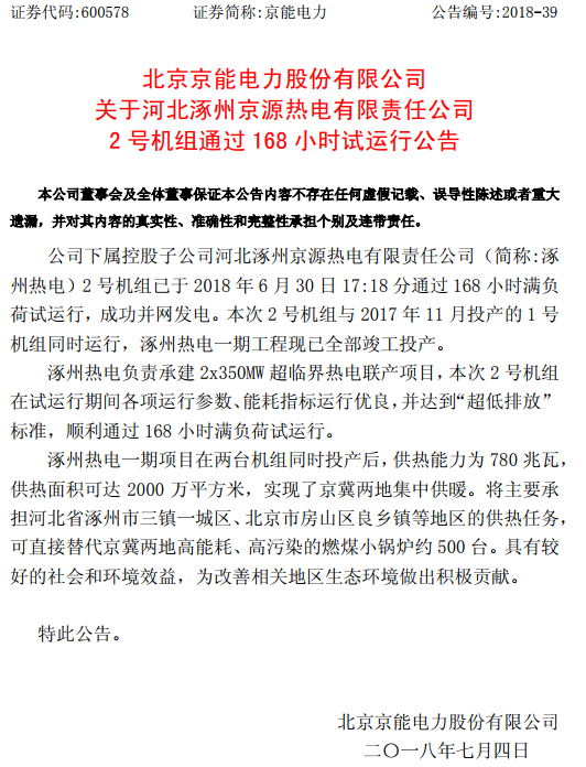 京能電力發(fā)布公告,下屬控股子公司涿州熱電2號(hào)機(jī)組已于6月30日17:18分通過(guò)168小時(shí)滿負(fù)荷試運(yùn)行,成功并網(wǎng)發(fā)電。本次2號(hào)機(jī)組與2017年11月投產(chǎn)的1號(hào)機(jī)組同時(shí)運(yùn)行,涿州熱電一期工程現(xiàn)已全部竣工投產(chǎn)。公告原文: