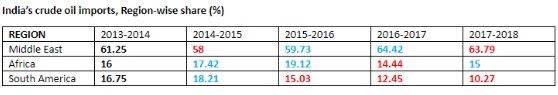 印度過去五年的區域原油進口數據顯示,中東國家的市場份額增加,而非洲和南美洲的份額在此期間有所下降。2017 - 2018年中東國家的比例從2013-2014財政年度的61%增加到64%。上個財政年度非洲國家的市場份額略微下降至15%,而2013 - 2014年為16%。