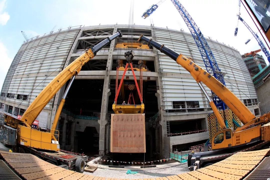 凝汽器是常規(guī)島最大的輔機(jī)設(shè)備,殼體則是凝汽器的重要部件之一,共有4個(gè)模塊,最重模塊達(dá)到148噸, 采用模塊化供貨安裝,在現(xiàn)場(chǎng)組對(duì)拼焊成一個(gè)整體。本次殼體模塊吊裝采用廠房外大型履帶吊起重機(jī)和廠房?jī)?nèi)橋式起重機(jī)相互配合方式,通過(guò)抬吊和連續(xù)換鉤等工序完成吊裝作業(yè)。