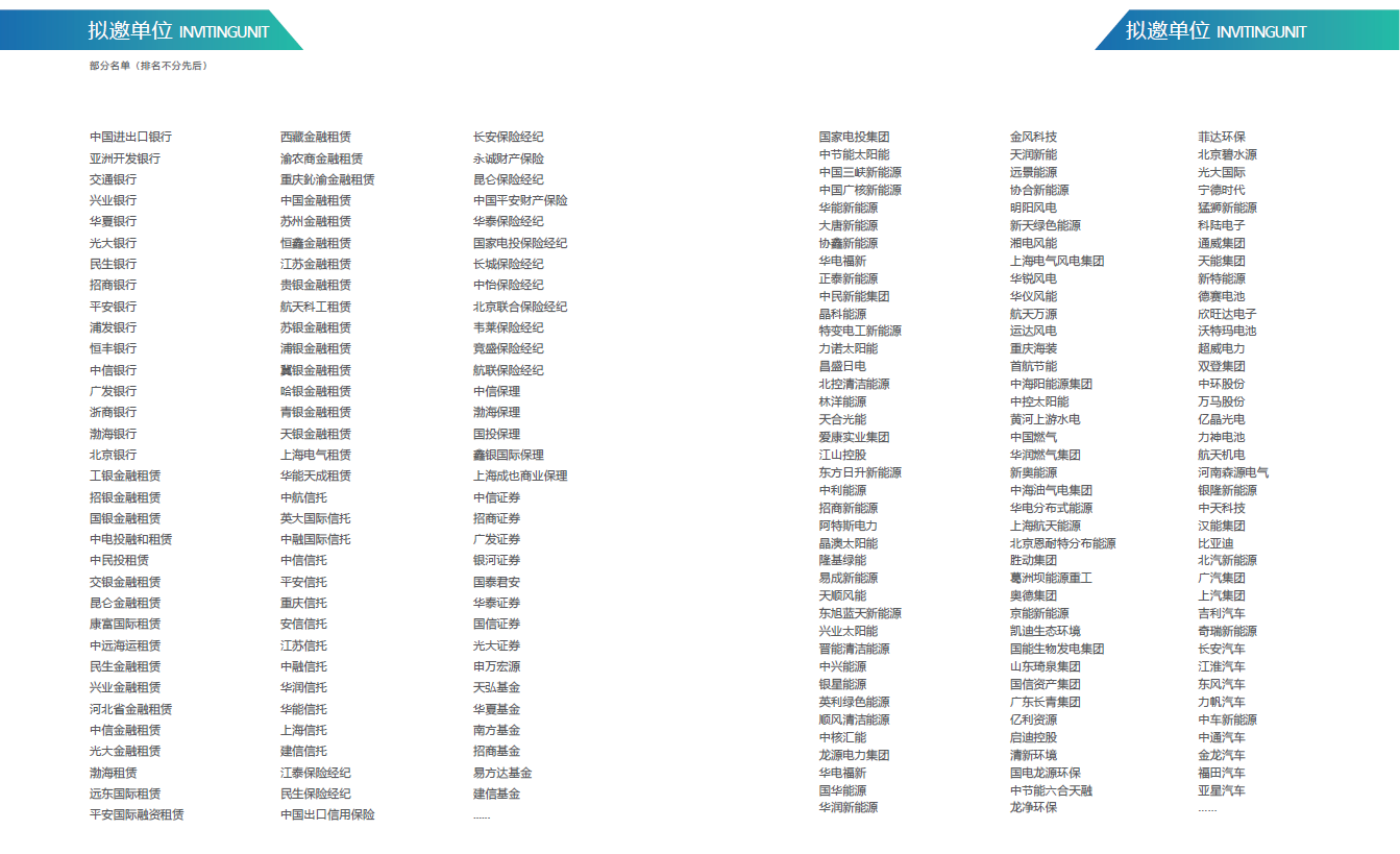 包容、開放、合作是“能金會”一貫主張,各路專家學者、行業大咖共聚一堂,為能源金融發展獻策獻力,實現行業的共享、共贏是大會不變的中心思想。據了解,第二屆“能金會”擬邀請國家級行業協會、重點科研院所、大型咨詢公司、銀行及各分行、融資租賃、保險信托、基金、證券、保理、資本、風投、金控等金融機構和央企及央企子公司、省市級地方國企、水電、儲能、太陽能、風能、氫能、生物質能、新能源汽車、節能、環保、分布式、創新技術、冷熱電聯產、綜合能源服務、能源EPC設計商、承建商等政府機構、科研單位、能源企業和國內權威媒體、行業媒體參會,會議規模預計將達700人。