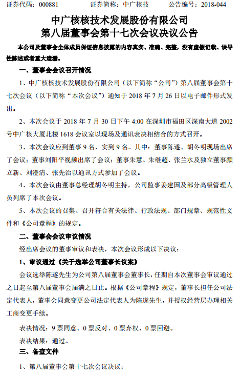 中廣核技發布《中廣核核技術發展股份有限公司第八屆董事會第十七次會議決議公告》,會議選舉陳遂先生為公司第八屆董事會董事長,任期自本次董事會審議通過之日起至第八屆董事會屆滿之日止。根據《公司章程》規定,董事長擔任公司法定代表人,董事會同意變更公司法定代表人為陳遂先生,并授權經營層辦理相關工商變更手續。公告原文: