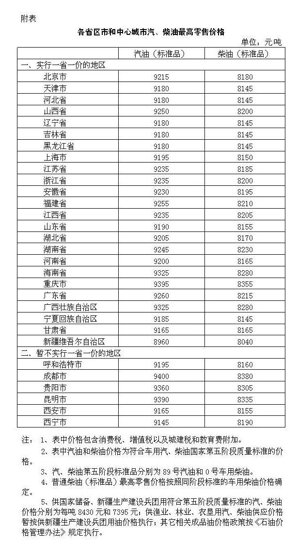 附:各省區(qū)市和中心城市汽、柴油最高零售價(jià)格