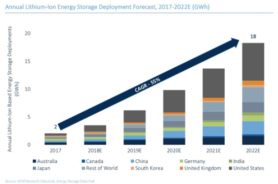 這種增長從一個規(guī)模很小的基礎(chǔ)上開始的,相比之下,電動汽車銷售僅在2017年就產(chǎn)生了112千兆瓦時的電池需求。然而,隨著年增長率達到55%,電網(wǎng)級儲能系統(tǒng)將足以提高和改變?nèi)螂姎庀到y(tǒng)的性能。