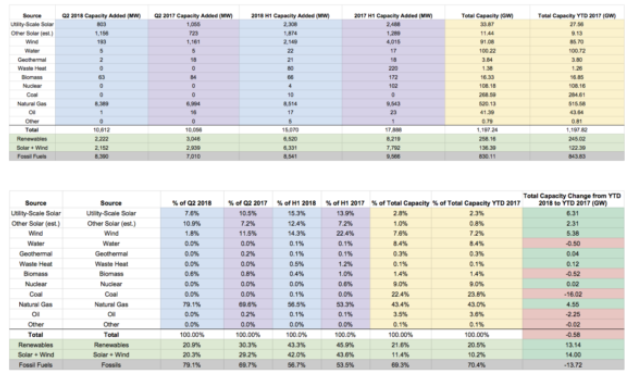 在2018年上半年,這些數字更好,但仍不如2017年那么好。可再生能源占該國新增電力容量的43%,低于2017年上半年的46%。(Solar +)風力占全國新增電力容量的42%,低于2017年上半年的44%。)