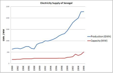 由于電力需求的增長(zhǎng)速度遠(yuǎn)快于供應(yīng),塞內(nèi)加爾面臨嚴(yán)重問(wèn)題。國(guó)家公用事業(yè)公司SENELEC缺乏有效的組織結(jié)構(gòu),缺乏(獲得資金)對(duì)發(fā)電廠和輸電線路的投資,以應(yīng)對(duì)不斷增長(zhǎng)的需求。目前儲(chǔ)備容量不足,導(dǎo)致整個(gè)地區(qū)頻繁(定期或不定期)停運(yùn),而輸電損失,舊火電廠和油價(jià)上漲導(dǎo)致平均生產(chǎn)成本高。下圖顯示了隨著時(shí)間的推移消費(fèi)和產(chǎn)能,支撐了上述情況。