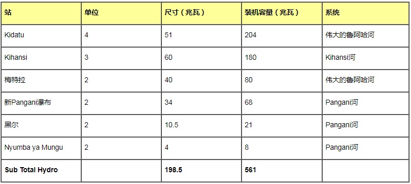 坦桑尼亞估計的總水電潛力為4700兆瓦。到2006年底,安裝的水力發電量為561兆瓦。表1列出了現有水電站的清單。