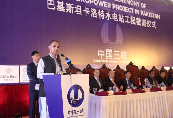 9月22日,在巴基斯坦旁遮普省卡洛特地區(qū),巴基斯坦能源部長奧馬爾·阿尤布·汗在卡洛特水電站項目截流儀式上致辭。 新華社記者劉天攝