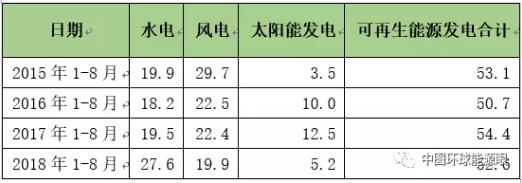 2018年1-8月,可再生能源發電投資額占全國電源工程完成投資額比重的52.6%,較上年同期降低1.8個百分點。