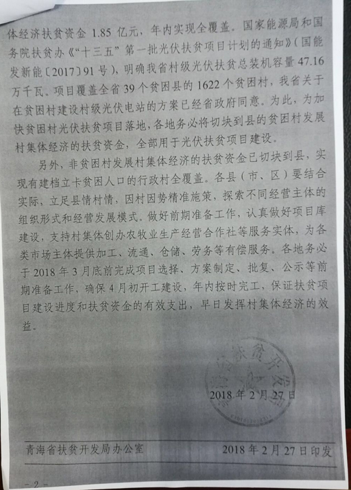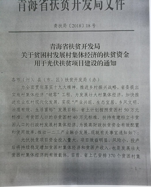 此外,通知中還指出目前省上已安排370個扶貧村集體經濟扶貧資金1.85億元,年內實現全覆蓋。根據國家能源局和國務院扶貧辦《“十三五”第一批光伏扶貧項目計劃的通知》(國能發新能[2017]91號),明確青海省村級光伏扶貧總裝機量47.16萬千瓦,項目覆蓋全省39個貧困縣的1622個貧困村,青海省關于貧困村建設村級光伏電站的方案已經省政府同意。