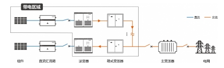 當(dāng)主電網(wǎng)沒有送電時(shí),可將任意某個(gè)發(fā)電單元作為電壓源,將PV組件直流電轉(zhuǎn)換成交流電壓,建立局域電網(wǎng)。該電壓通過箱變升壓成中壓,由于所有發(fā)電單元公用中壓母線,所以其余單元逆變器、箱變、高壓柜、計(jì)量柜、測控均可在該電網(wǎng)下進(jìn)行帶電調(diào)試。相較于之前的并網(wǎng)后再調(diào)試,可以縮短工期,提前了解設(shè)備情況,及時(shí)發(fā)現(xiàn)問題,極大縮短施工周期,實(shí)現(xiàn)早并網(wǎng)、早發(fā)電。