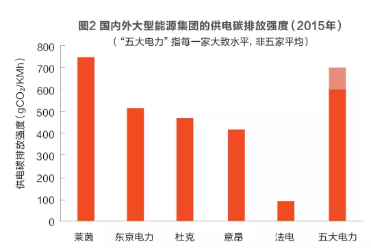 全球主要發電集團,包括法國電力(EDF)、意昂集團(E.ON)、杜克能源(Duke Energy)、萊茵集團(RWE)、東京電力(TEPCO),2015年各自碳排放總量大約在0.5~1.5億噸二氧化碳當量的水平,同期中國的五大發電集團,每一家的碳排放總量均在3~4億噸二氧化碳當量的水平(圖1),遠高于全球主要發電集團的水平,相當于一個中等規模的發達國家的排放量(如英國),在排放量上可謂“富可敵國”。