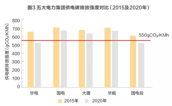 2016年發布的《“十三五”控制溫室氣體排放工作方案》要求2020年大型發電集團單位供電二氧化碳排放控制在550克二氧化碳/千瓦時以內,根據對五大發電集團已經公開的“十三五”規劃部分數據進行測算,預計兩家有望完成指標要求(國電投、華電),另外三家需要付出艱巨的努力,但能否完成仍然不容樂觀(圖3)。此外,《電力發展“十三五”規劃(2016-2020年)》同時提出,30萬千瓦級以上具備條件的燃煤機組全部實現超低排放,煤電機組二氧化碳排放強度下降到865克/千瓦時左右的目標。