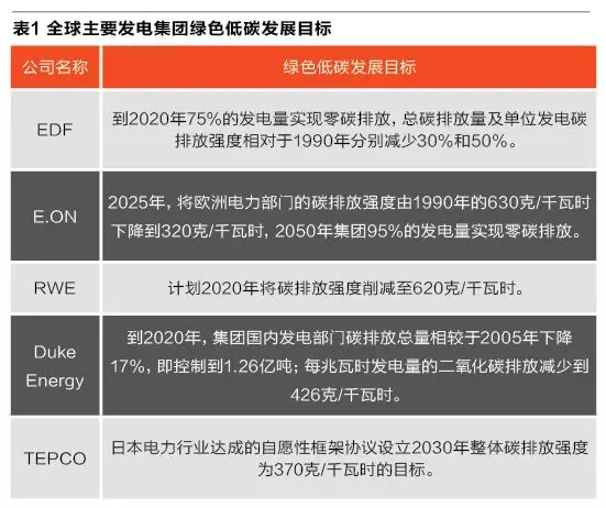 ?第二,規劃引領,確立以“碳”為統領的發展目標。落實碳排放管理,推行以“碳”為統領的發展目標必須成為發電集團實現總體戰略目標的重要抓手。目前,全球主要發電集團均確立了各自的碳排放控制目標(表1)。中國大型發電集團也不甘落后,以華能集團為例,早在2010年的《華能集團綠色發展行動計劃》中,即提出到2020年集團供電碳排放強度降至525gCO/KWh(目前看來,這個指標完成的難度不小)、清潔能源裝機達到35%的低碳發展目標。華電集團在2017年集團年度工作會議上,提出到2020年單位電能碳排放指標較“十二五”末降低20%、單位電能化石能源消耗降低20克的低碳發展目標,引領集團低碳發展新方向。
