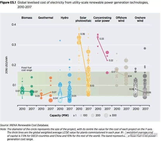 可再生能源署(IRENA)發布《可再生能源發電成本報告》,披露全球范圍內2017年投運的生物質發電、地熱發電、水電、陸上風電、海上風電、光熱發電、大型地面光伏的加權平準發電成本(levelised cost of electricity,簡稱LCOE,以2016年美元不變價格計算)。針對每一種技術,LCOE的計算考慮全生命周期內的投資、運營成本和收益,包括資本成本(中國和經合組織國家為7.5%,其他國家10%)。