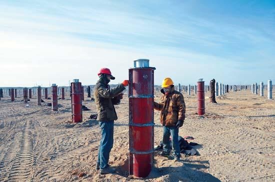 玉門鑫能鄭家沙窩5萬千瓦熔鹽塔式光熱發(fā)電項(xiàng)目建設(shè)現(xiàn)場。該項(xiàng)目總投資17.9億元,占地2.47平方公里,計(jì)劃建設(shè)總裝機(jī)容量5萬千瓦的熔鹽塔式光熱電站,建成后,年發(fā)電量可達(dá)2.02億千瓦時(shí)。