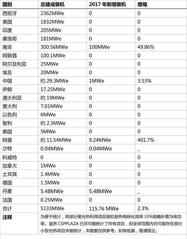阿拉伯半島上的阿曼于2017年11月成功投運了全球最大的太陽能EOR項目——總裝機達1GWth的Miraah項目的第一期項目,實現了近28MWth的裝機,折合9.24MWe。(為便于統計,本網對光熱裝機量的統計以發電功率為統一計量單位,將部分聚光熱利用項目裝機按熱電轉化效率33%粗略折算為電功率,該項目折算為9.24MWe)
