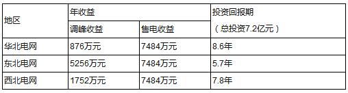 同樣以橋灣變電站120MW/240MWh獨立儲能電站為例,假設一天參與兩次調峰,且儲存的電量在用電高峰時段按照風電上網電價賣出(按0.5元/kWh計算),充放電效率90%,一年按365天計算,則不同地區的收益情況如下表: