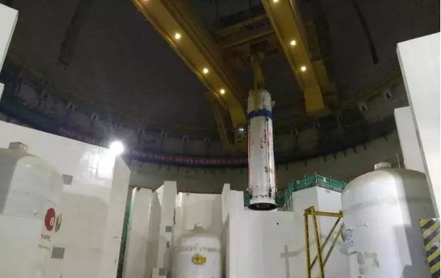 福清5號穩(wěn)壓器空重約104噸,總高13.8米,要將其引入核島需跨越壓力容器及大半個核島,還要避開前期已就位的蒸汽發(fā)生器和主泵等核島主設(shè)備,安裝工作難點(diǎn)多且就位要求高。為此核動力院設(shè)計人員提前進(jìn)駐現(xiàn)場,與安裝單位現(xiàn)場分析解決問題,同步修改完善安裝方案,16日歷經(jīng)吊裝、引入、翻轉(zhuǎn)等工序后吊入穩(wěn)壓器隔間,最終于12時26分成功安裝就位。