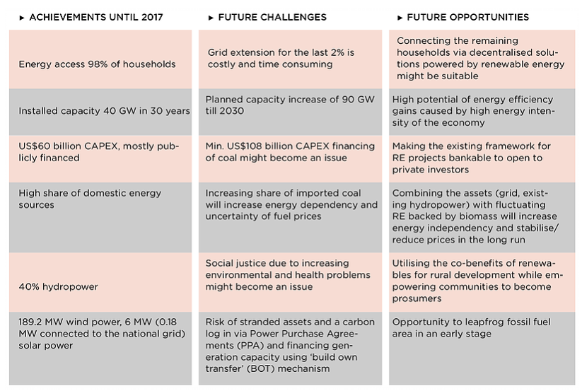 2030年,可再生能源解決方案(不包括大型水電)將只提供高達10%的裝機容量的少量份額。由于溫室氣體排放量較低,越南在理論上有一個跨越式的機會窗口化石燃料投資和體驗相對無痛的過渡。為了避免將國家鎖定在化石燃料結(jié)構(gòu)中的道路,伴隨著越來越多的滯留資產(chǎn)以及更高的能源依賴性,需要政治意愿。為了加速可再生能源的潛力并開始側(cè)重于可再生能源的共同效益的社會和公正的能源轉(zhuǎn)型,需要開發(fā)化石燃料和可再生能源發(fā)電的公平競爭。